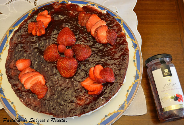 Depois do cheesecake estar sólido, barre toda a superfície com o doce de frutos silvestres.